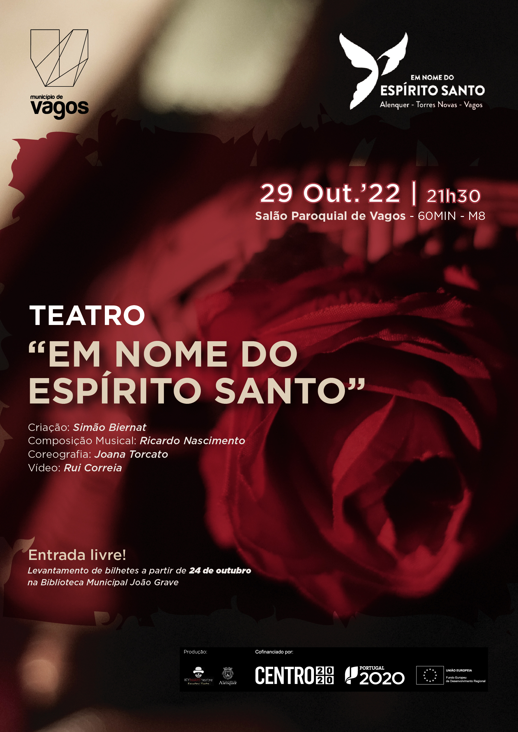 Ao abrigo da Candidatura “Em nome do Espírito Santo realiza-se, no próximo dia 29 de outubro de 2022, pelas 21h30, no Auditório do Salão Paroquial de Vagos, a peça de teatro “Em Nome do Espírito Santo”, com produção e realização de MYHEARTHEATRE.