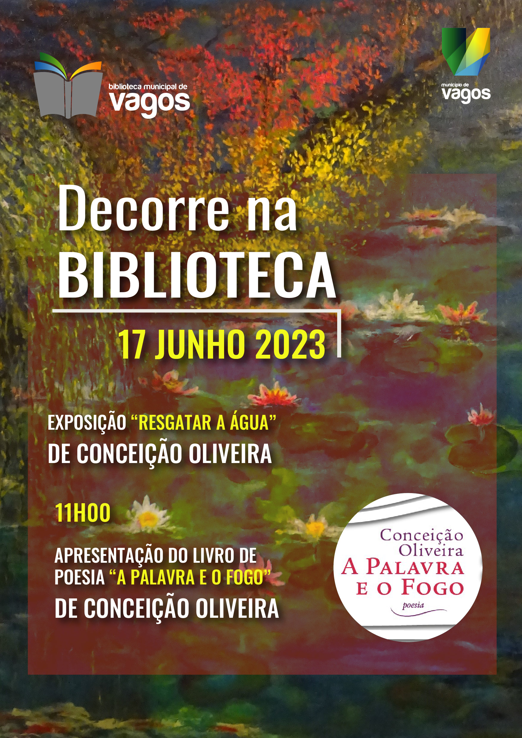 Pelas 11h00 a Biblioteca acolhe a apresentação do livro de poesia “A Palavra e o Fogo” e a apresentação ao público da exposição “Resgatar a Água”, ambos da autoria de Conceição Oliveira. A exposição ficará patente na biblioteca municipal a partir de 17 de junho, de segunda a sexta-feira, das 10h00 às 12h30 e das 14h00 às 18h00 e aos sábados das 10h00 às 13h00.