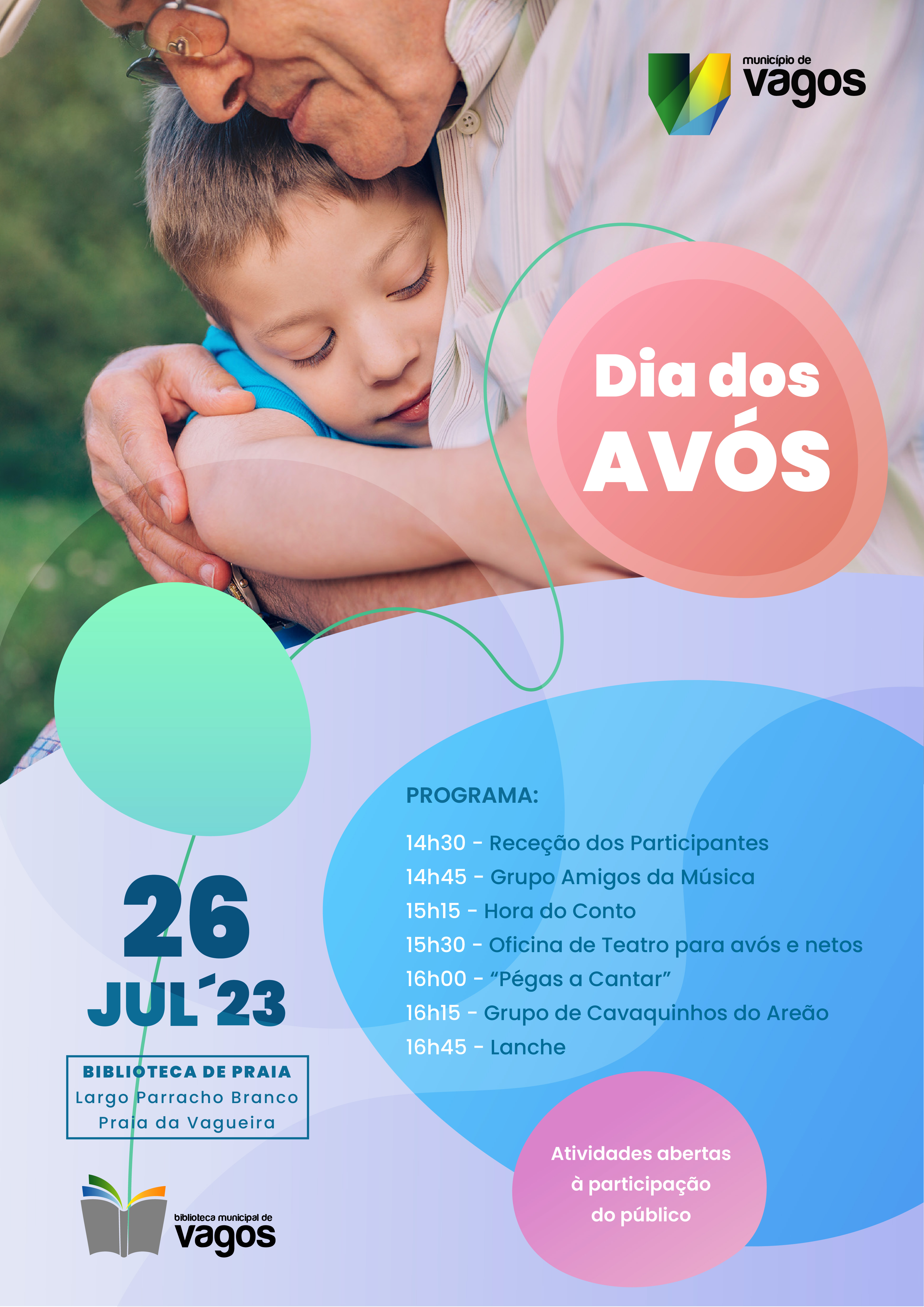 O “Dia dos Avós” celebra-se no dia 26 de julho de 2023 e para comemorar este dia tão especial, o Município de Vagos irá promover diversas atividades, na Biblioteca de Praia, no Largo Parracho Branco, na Praia da Vagueira.