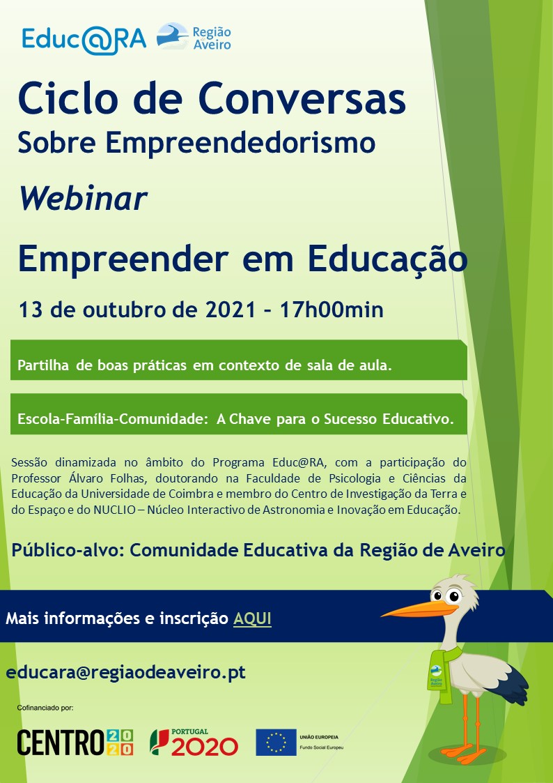 No âmbito da iniciativa “Ciclo de Conversas sobre Empreendedorismo”, promovida pela Comunidade Intermunicipal da Região de Aveiro (CIRA), através do Programa Educ@RA – Plano Integrado e Inovador de Combate ao Insucesso Escolar (PIICIE), realiza-se, no próximo dia 13 de outubro de 2021, pelas 17h00, o Webinar “Empreender em Educação”. A inscrição é gratuita, mas obrigatória e deve ser realizada através do formulário disponível.