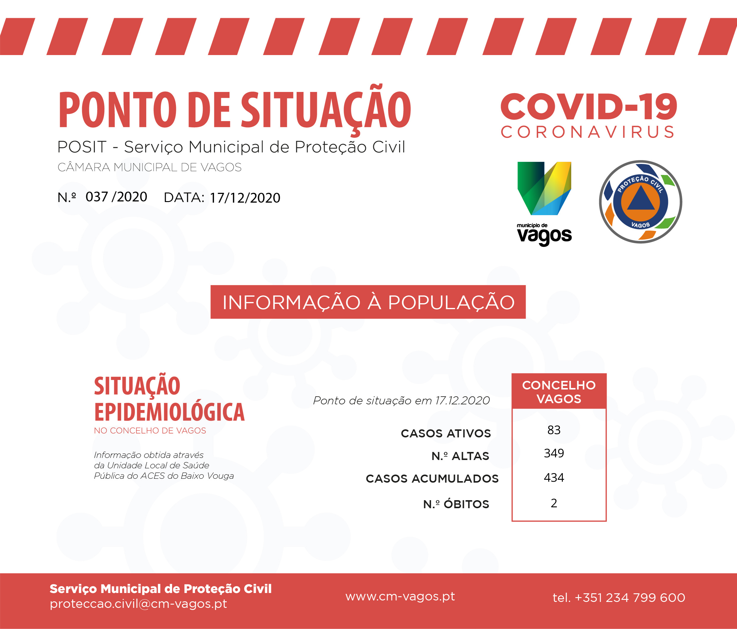 O Serviço Municipal de Proteção Civil da Câmara Municipal de Vagos emitiu, hoje, dia 17 de dezembro de 2020, um novo ponto de situação municipal no âmbito da pandemia COVID-19.