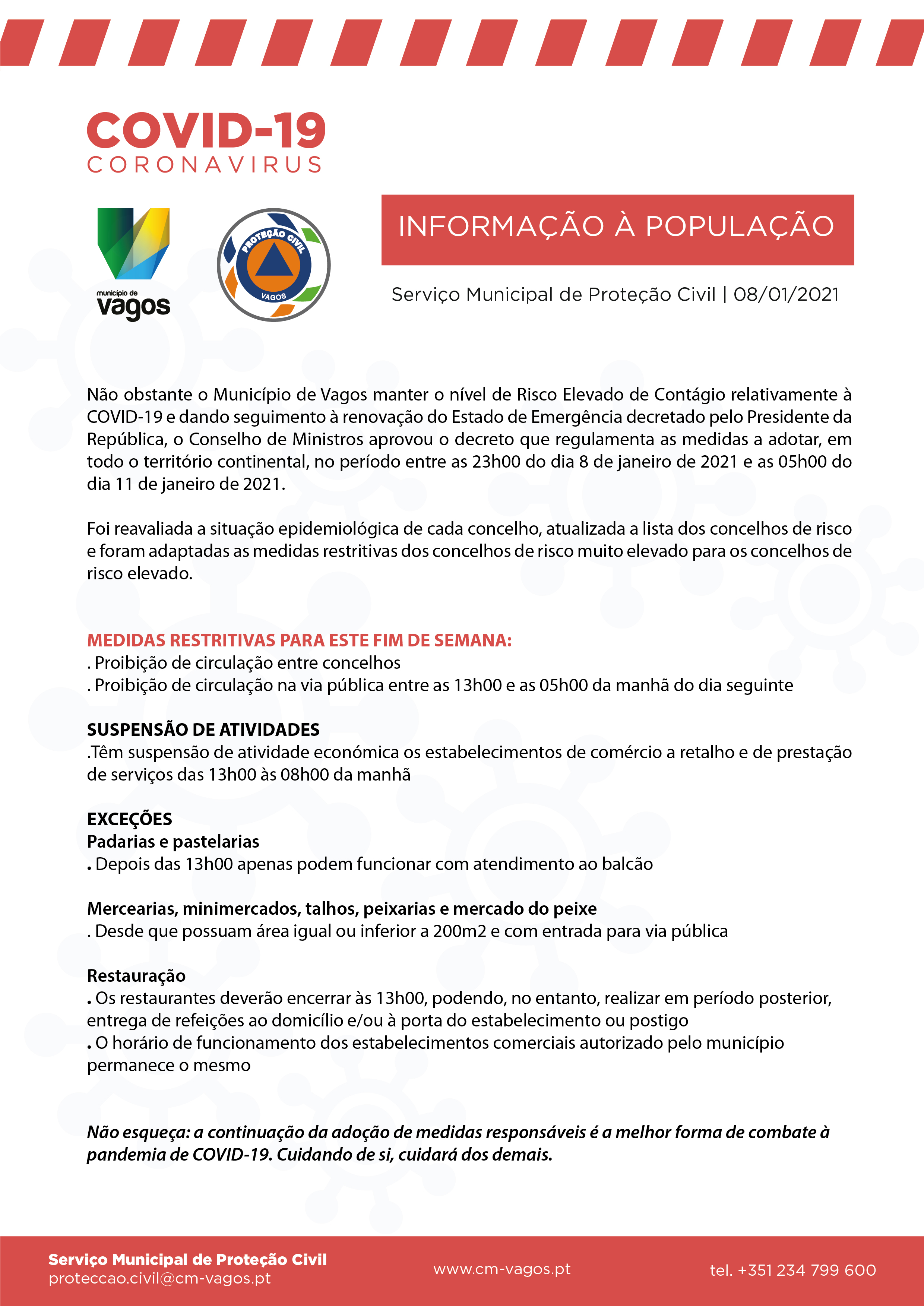 Não obstante o Município de Vagos manter o nível de Risco Elevado de Contágio relativamente à COVID-19 e dando seguimento à renovação do Estado de Emergência decretado pelo Presidente da República, o Conselho de Ministros aprovou o decreto que regulamenta as medidas a adotar, em todo o território continental, no período entre as 23h00 do dia 8 de janeiro de 2021 e as 05h00 do dia 11 de janeiro de 2021.