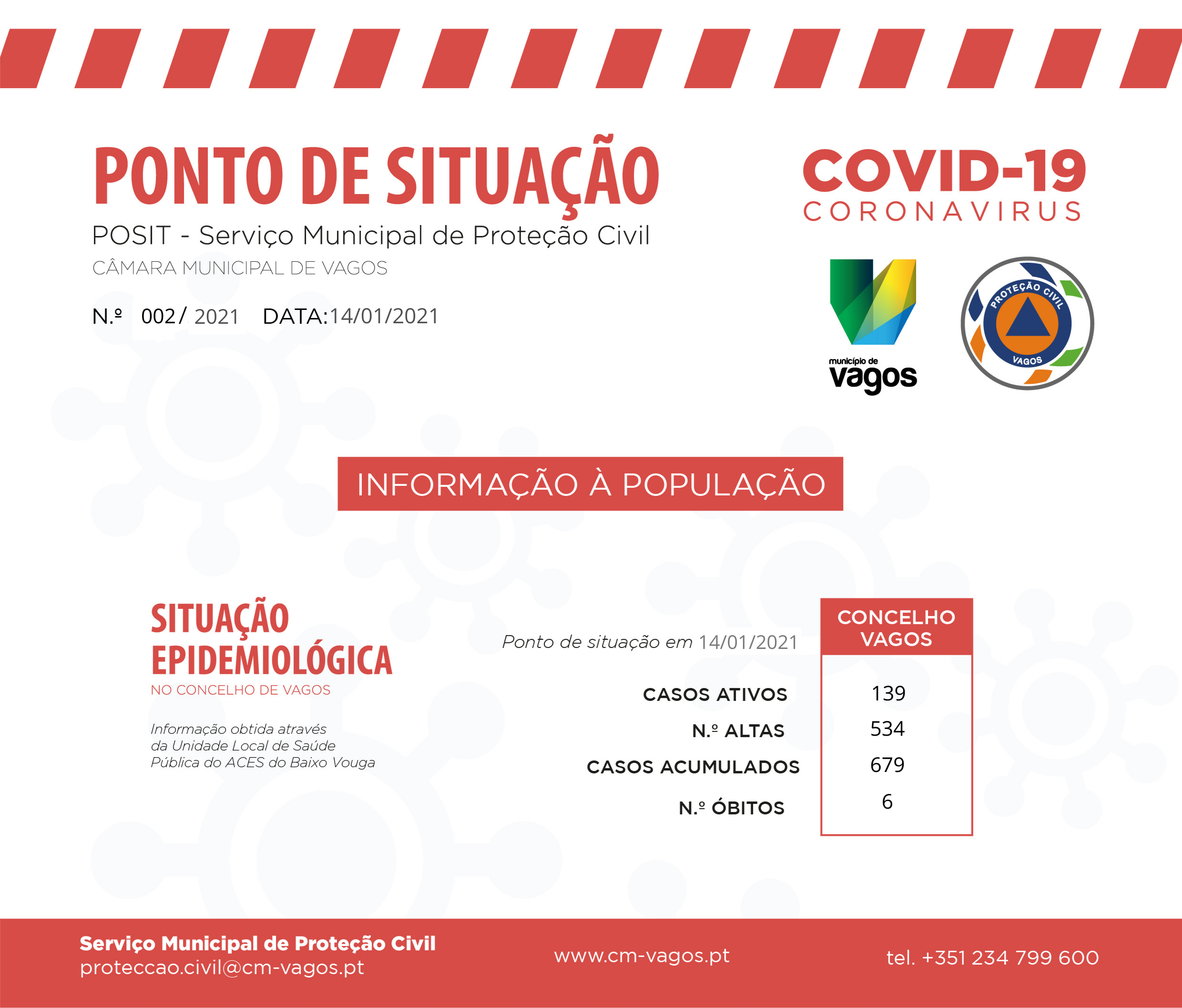 O Serviço Municipal de Proteção Civil da Câmara Municipal de Vagos emitiu, hoje, dia 14 de janeiro de 2021, um novo ponto de situação municipal no âmbito da pandemia COVID-19.