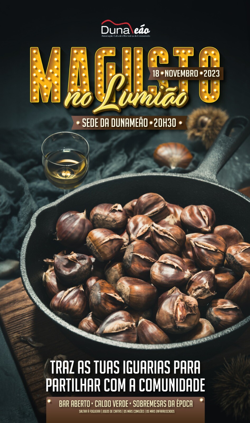 Decorre, no dia 18 de novembro de 2023, a partir das 20h30, na sede da associação Dunameão, o "Magusto no Lumião".