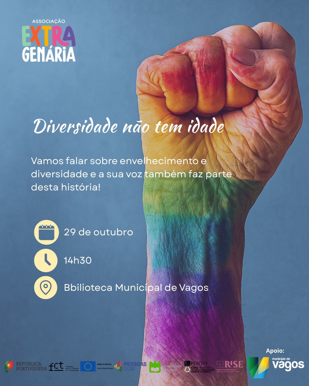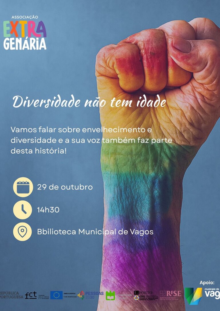 A sessão “A diversidade não tem idade”, organizada pela Associação Extragenária, realiza-se no próximo dia 29 de outubro, às 14h30, na Biblioteca Municipal de Vagos.