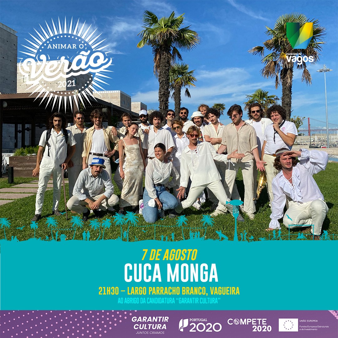 Realiza-se, no sábado, dia 7 de agosto de 2021, o espetáculo musical com "CUCA MONGA", às 21h30, no Largo Parracho Branco - Praia da Vagueira.