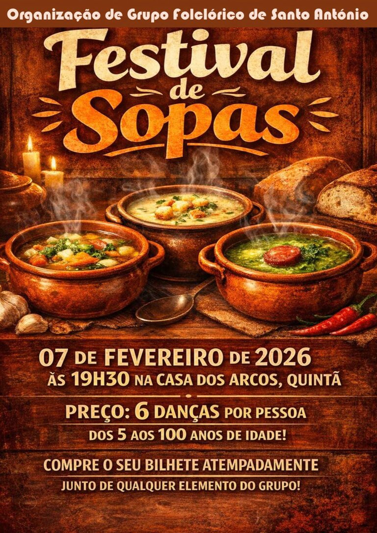 O Festival de Sopas vai decorrer no próximo dia 7 de fevereiro de 2026 (sábado), a partir das 19h30, na Casa dos Arcos, em Santo António de Vagos.