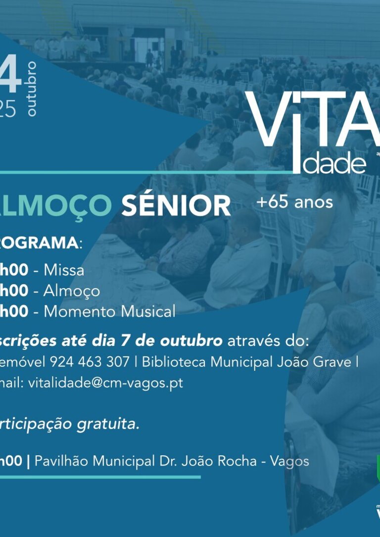 O Município de Vagos convida todos os maiores de 65 anos, residentes no concelho de Vagos, a um dia especial de partilha e convívio no Pavilhão Municipal Desportivo de Vagos, no dia 14 de outubro.