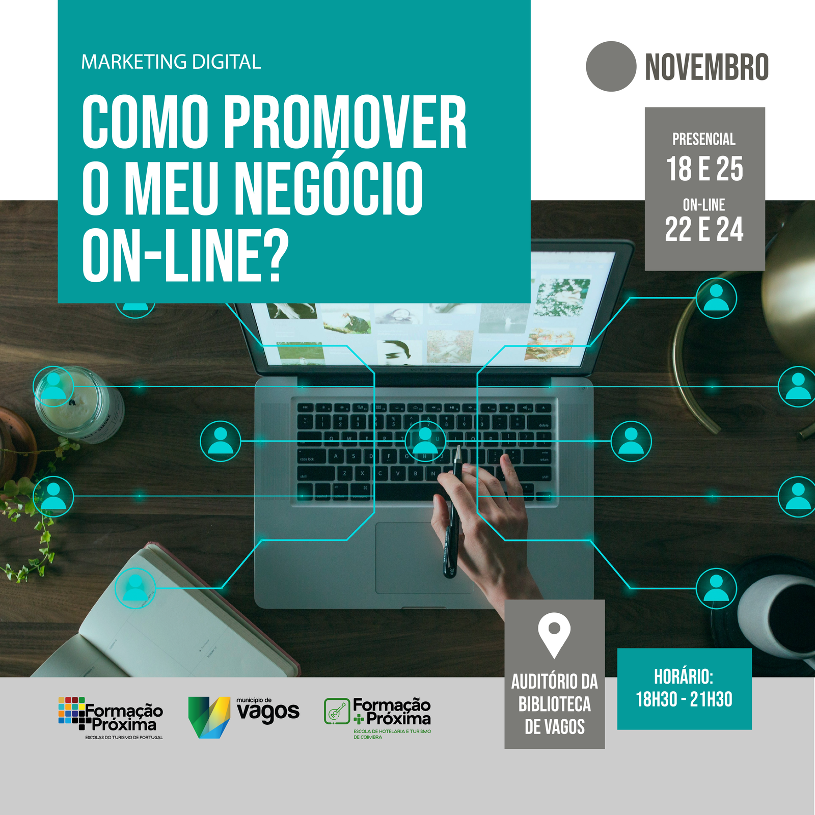 Esta formação é gratuita e tem a duração de 12 horas, em formato misto, com formação presencial nos dias 18 e 25 de novembro e on-line nos dias 22 e 24 de novembro, das 18h30 às 21h30. A formação presencial terá lugar no auditório da Biblioteca Municipal de Vagos.