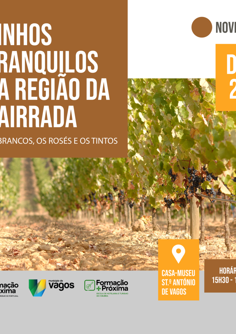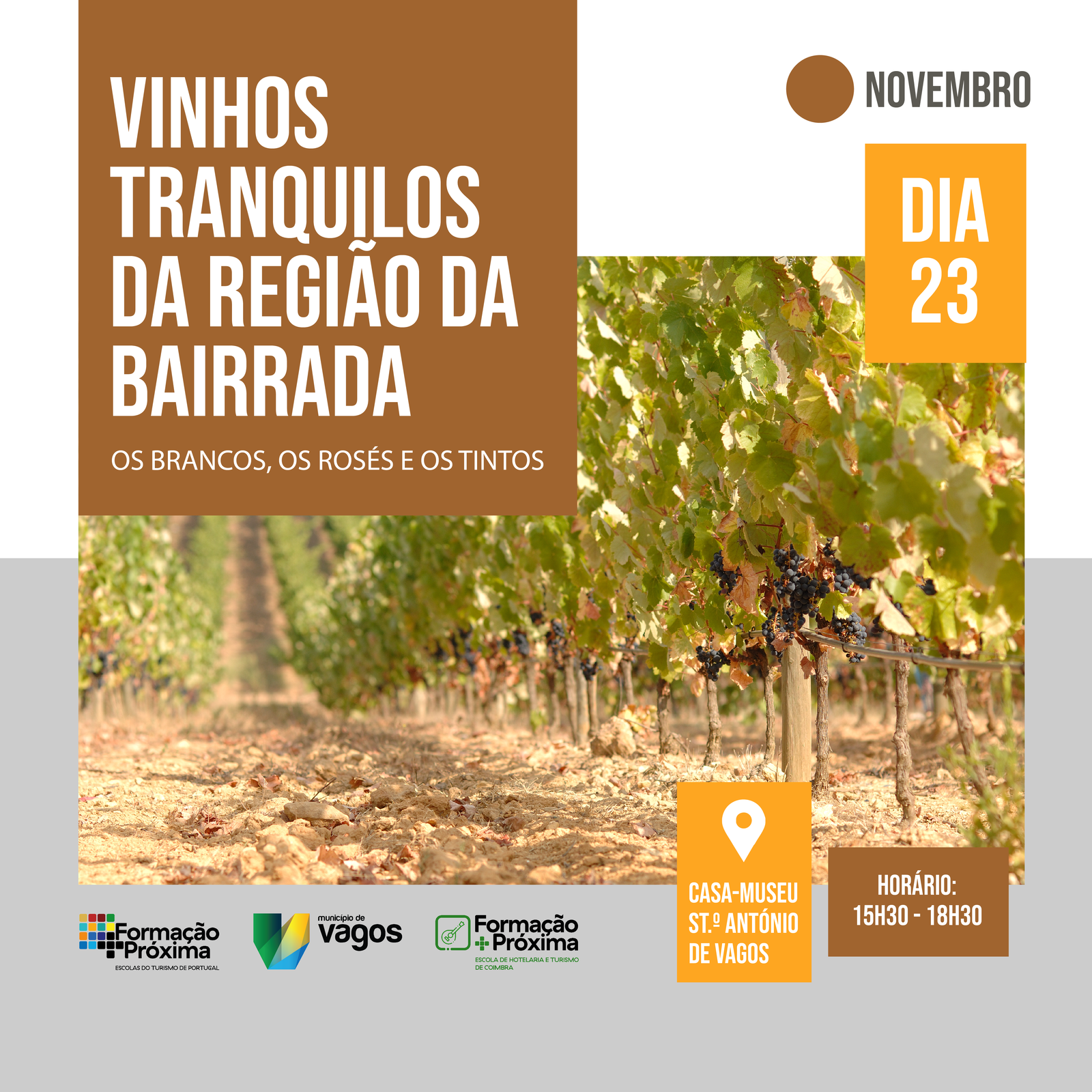 Realiza-se, no dia 23 de novembro de 2022, a ação de formação “Vinhos tranquilos da Região da Bairrada – os Brancos, os Rosés e os Tintos”, no âmbito da “Formação + Próxima”, do Turismo de Portugal e é dirigida à restauração, profissionais do serviço de vinhos e outros interessados na temática.