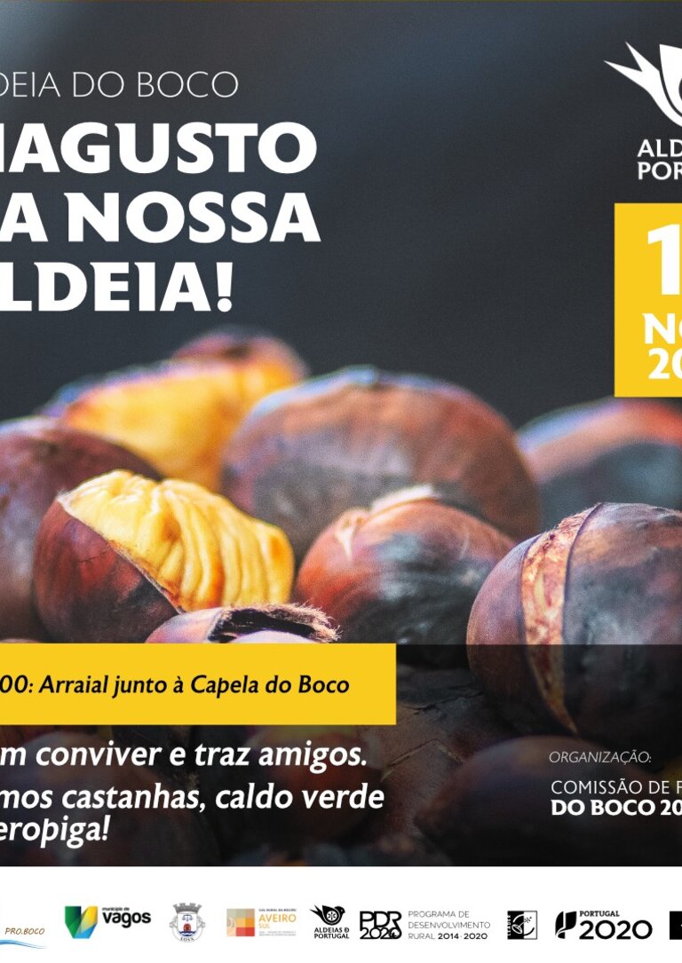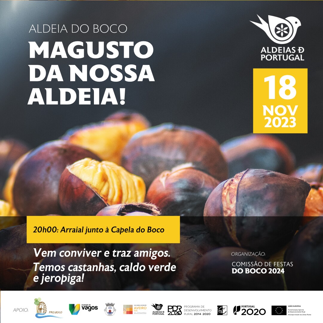 No próximo dia 18 de novembro de 2023, pelas 20h00, realiza-se “O Magusto da nossa aldeia”, no Boco, Aldeia de Portugal. Haverá castanhas, caldo verde e jeropiga para todos aqueles que pretendam vir passar um serão de convívio com a população local.