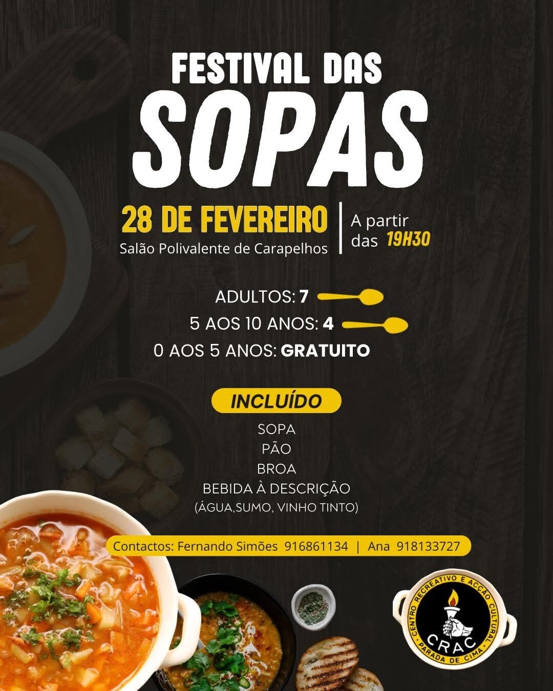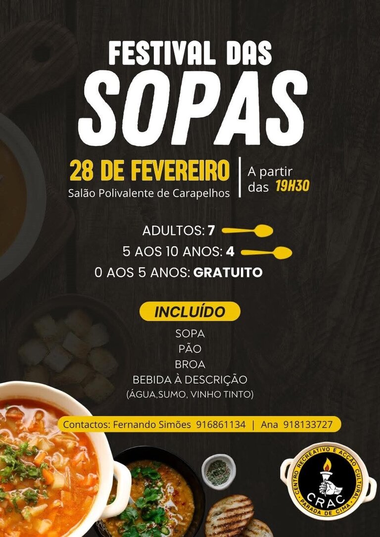Uma noite de sabores reconfortantes espera por si no Festival das Sopas, uma iniciativa do CRAC – Centro Recreativo e Ação Cultural da Parada de Cima.