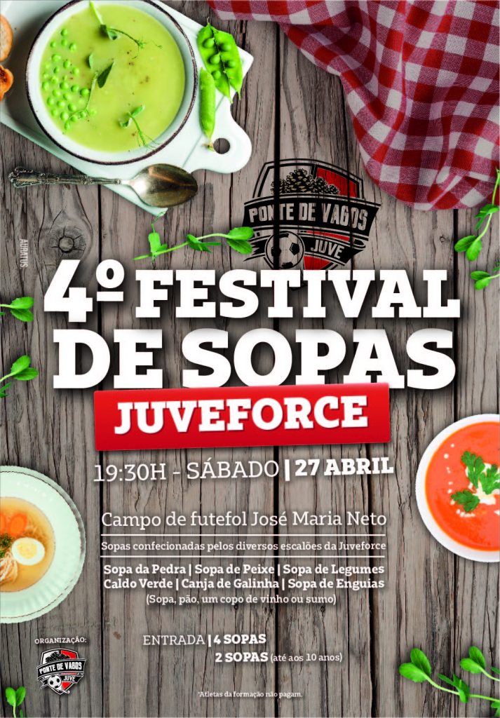 O Clube Desportivo JuveForce da Ponte Vagos irá realizar o 4º Festival das Sopas , no dia 27 de abril, pelas 19:30h, no campo de futebol José Maria Neto.