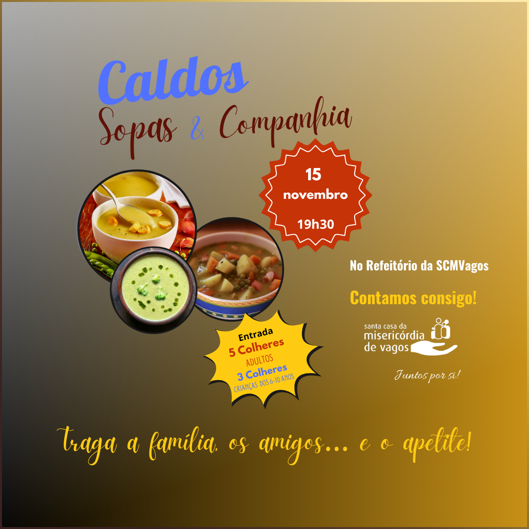 No próximo dia 15 de novembro, a Santa Casa da Misericórdia de Vagos convida toda a comunidade para o evento “Caldos, Sopas & Companhia”, uma iniciativa solidária repleta de sabores e espírito de partilha.