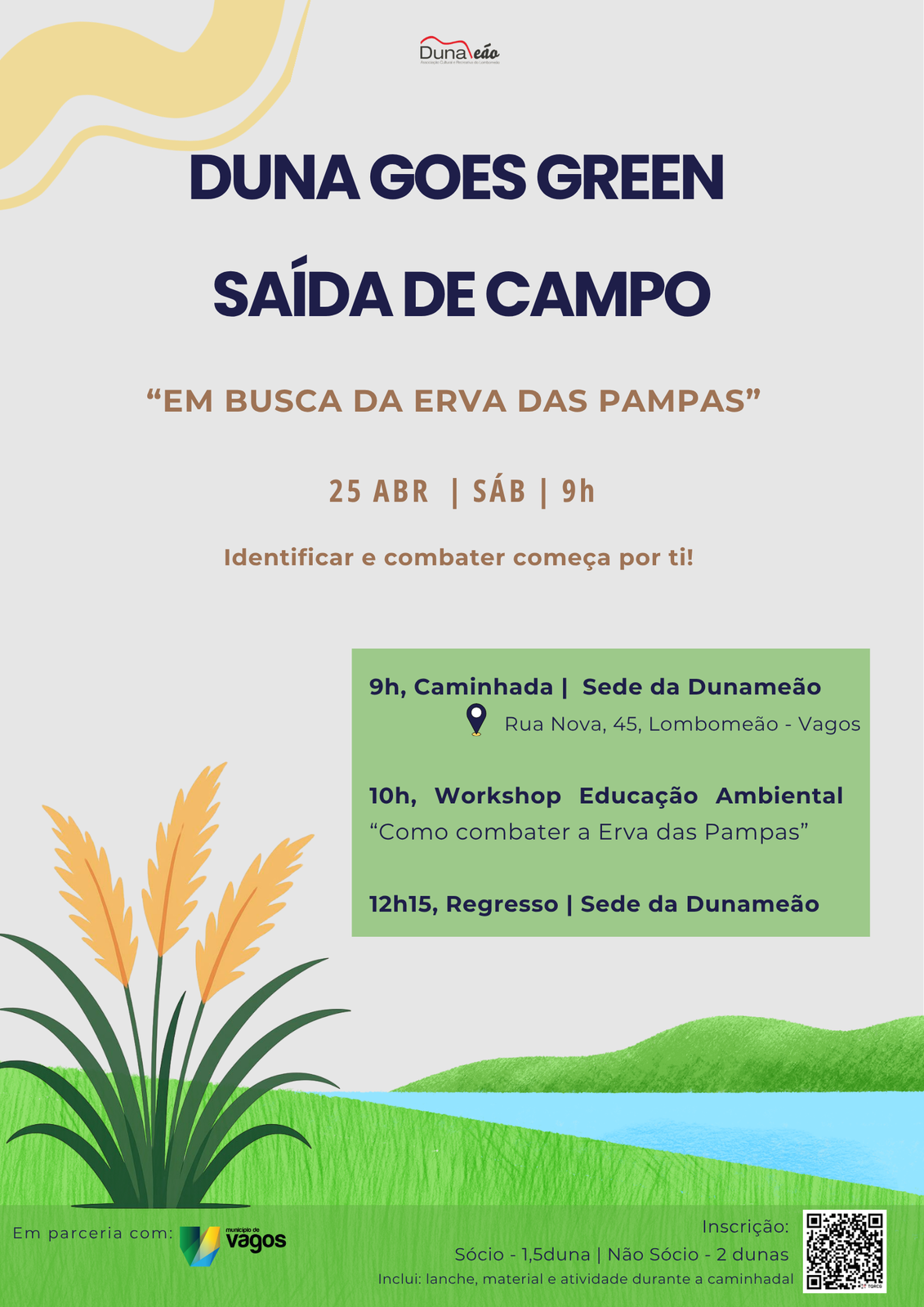 A 3.ª edição do “Duna Goes Green” realiza‑se no próximo dia 25 de abril de 2026, numa iniciativa promovida pela Associação Dunameão em parceria com a Câmara Municipal de Vagos, integrada no Plano de Ação de Controlo de Cortaderia, espécie invasora amplamente disseminada na região.